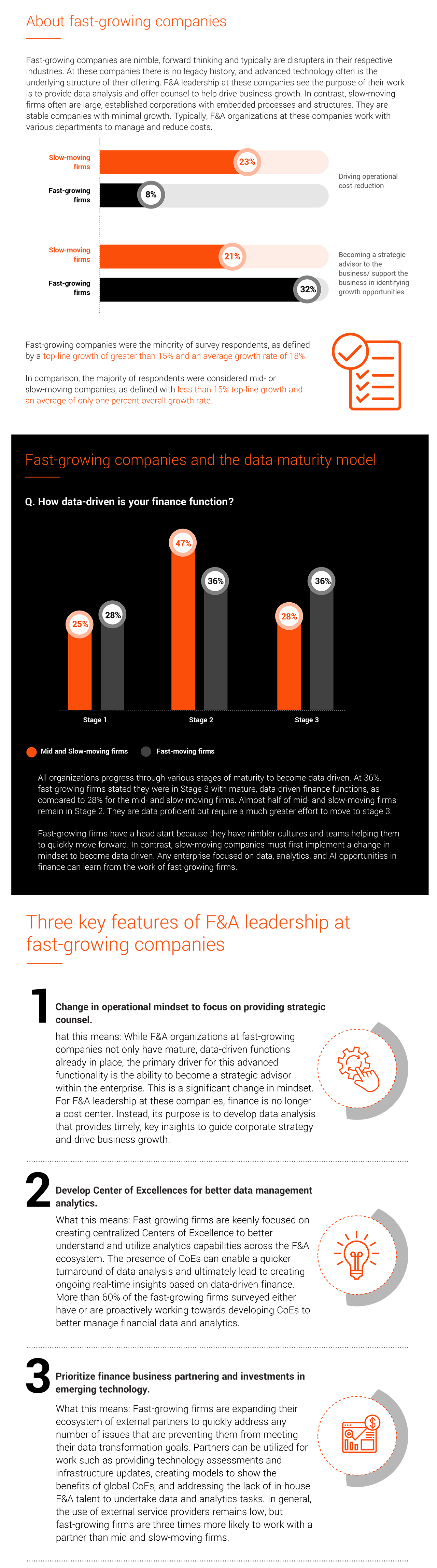 HFS Research in partnership with EXL surveyed more than 200 finance and accounting leaders worldwide and across industries in 2022. This work looked at how these organizations are changing to become data-driven, so they can use data as a strategic asset to quickly generate timely insights. A key finding from this research was that F&A organizations at fast-growing companies are much further along, both in strategy and action, in becoming data driven as compared to their counterparts at mid and slow-moving firms.