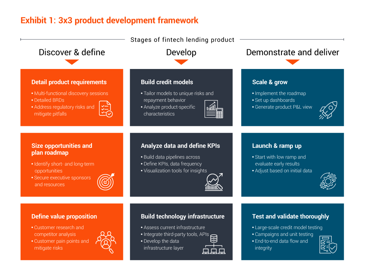 To operationalize hyper-personalized lending with speed and precision, EXL’s 3x3 product strategy and development framework simplifies workflows, reduces internal confusion, and creates an execution path that supports multi-product portfolios. The framework is organized across three stages, including discover and define, develop, demonstrate, and deliver. At each stage, clear building blocks drive the framework.